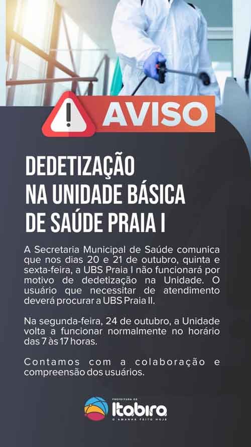 A Secretaria Municipal de Saúde comunica que a Unidade Praia I estará fechada nos dias 20 e 21 de outubro, quinta e sexta-feira, por motivo de dedetização.