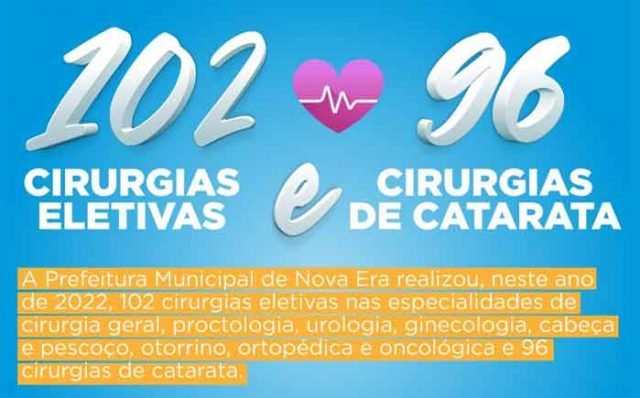 A Prefeitura Municipal de Nova Era realizou, neste ano de 2022, 102 cirurgias eletivas nas especialidades de cirurgia geral, proctologia, urologia, ginecologia, cabeça e pescoço, otorrino, ortopédica e oncológica e 96 cirurgias de catarata.