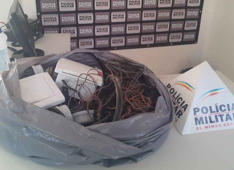Posteriormente, durante patrulhamento da BASE COMUNITÁRIA MÓVEL, recebemos denúncias de que novamente autores estariam no local furtando as fiações, os militares avistaram um suspeito enrolando as fiações e as escondendo em um jardim da praça em uma sacola plástica, e juntamente ao seu lado um alicate que estava sendo usado para os cortes dos fios.