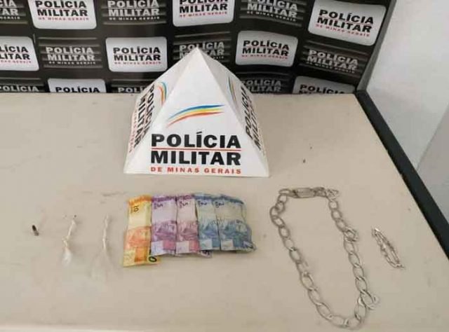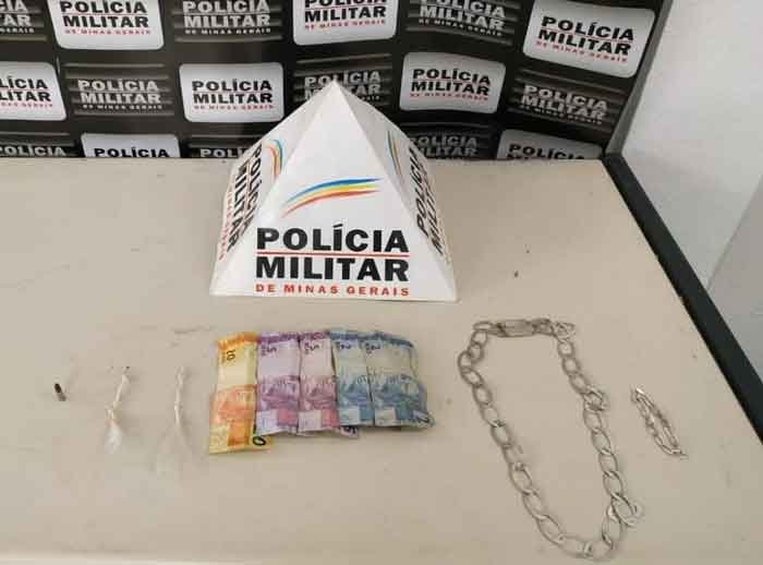 Materiais apreendidos: 08 Pedras de crack, R$ 34,00, 01 Munição calibre .22, Cordão e pulseira prateados