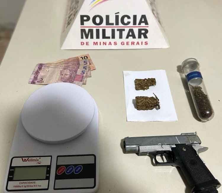 Uma equipe policial militar deslocou até o local, onde encontrou o suspeito de 26 anos e próximo dele uma porção de maconha. Em continuidade às diligências, na residência do denunciado, foram localizados ainda: 01 simulacro de arma de fogo; R$25,00 em dinheiro; outras porções de maconha prensada e 01 tubo de plástico contendo maconha esfarelada, além de 01 balança de precisão.