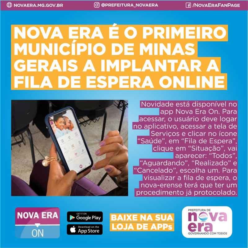 Nova Era é a primeira cidade do estado de Minas Gerais a implementar o sistema de visualização da fila de espera. A Prefeitura Municipal de Nova Era lança seu aplicativo de atendimento à população e modernização da gestão pública: o Nova Era ON. A tecnologia permite facilitação na prestação de serviços, tornando-a mais eficaz através de uma plataforma especializada. Além disso, o cidadão conta com muito mais rapidez para solicitar demandas e realizar seus cadastramentos, com inúmeras comodidades em um simples clique no celular.