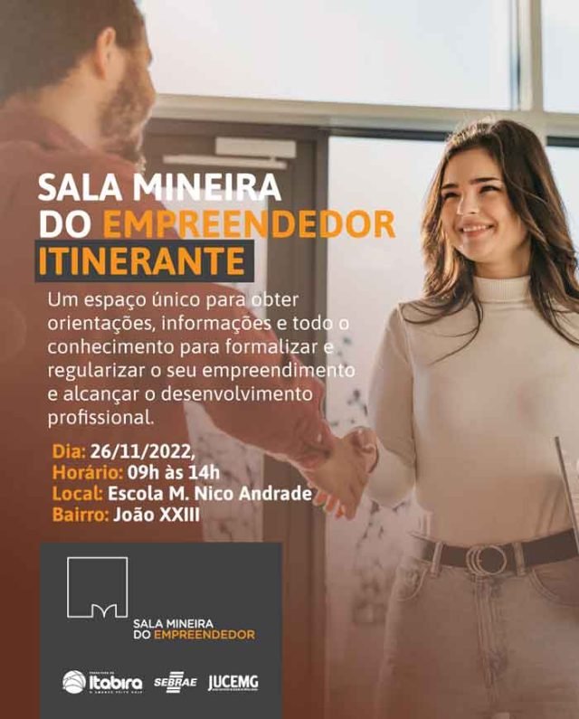 A primeira edição da Sala Mineira do Empreendedor Itinerante em Itabira será no próximo sábado (26), na Escola Municipal Nico Andrade, no bairro João XXIII, com atendimento das 9h às 14h. O espaço oferece oportunidade para obter informações, orientações e todo o conhecimento para formalizar e regularizar um empreendimento, além de capacitação para alcançar o desenvolvimento profissional.
