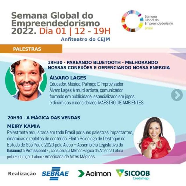 Na sequência, às 20h30, a psicóloga e mestre em Administração Meiry Kamia, realiza a palestra sobre “Mágica nas Vendas”. A intenção é capacitar os empreendedores, por meio de técnicas baseadas no comportamento humano, para aumentar a motivação e o desempenho dos colaboradores.