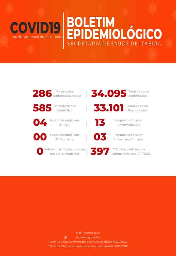 Segue Boletim Covid de hoje 06de dezembro de 2022