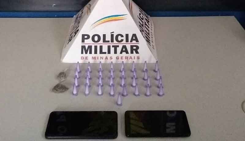 Dois adolescentes suspeitos foram apreendidos com drogas no bairro Triângulo Novo, em Ponte Nova, nessa quarta-feira, (21/12) por volta das 13hrs. Em patrulhamento, militares avistaram dois indivíduos transitando em via pública, que ao notarem presença policial entraram em um comércio. Diante da suspeição foi realizada varredura no estabelecimento comercial, onde foi encontrada uma embalagem com 33 pinos de cocaína e duas buas buchas de maconha.