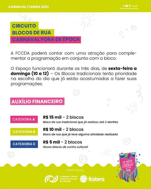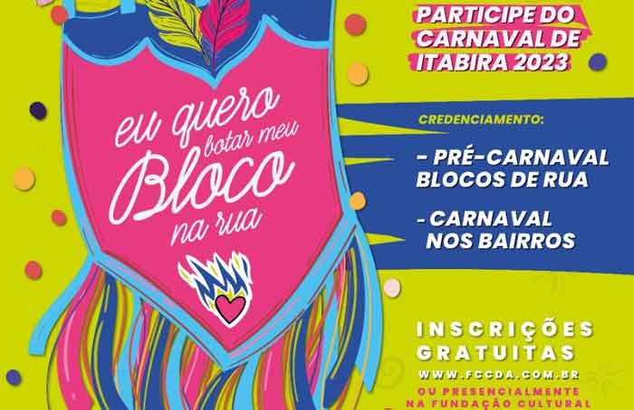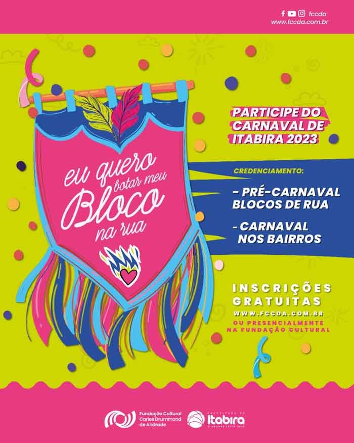 Para estimular e incentivar o carnaval popular em Itabira, a Prefeitura, por meio da Fundação Cultural Carlos Drummond de Andrade (FCCDA), publicou o edital de convocação para os blocos da cidade que desejam participar do pré-carnaval da folia de 2023 e também para associações e produtores desenvolverem a festa de carnaval em bairros da cidade. O documento tem como objetivo credenciar propostas artísticas culturais para os projetos “Circuito Blocos – Carnaval Fora de Época” e “Circuito Carnaval de Rua”. As inscrições gratuitas podem ser feitas até 13 de janeiro pelo site www.fccda.com.br