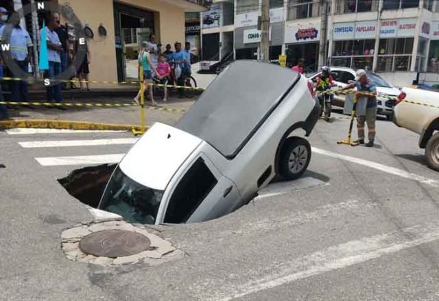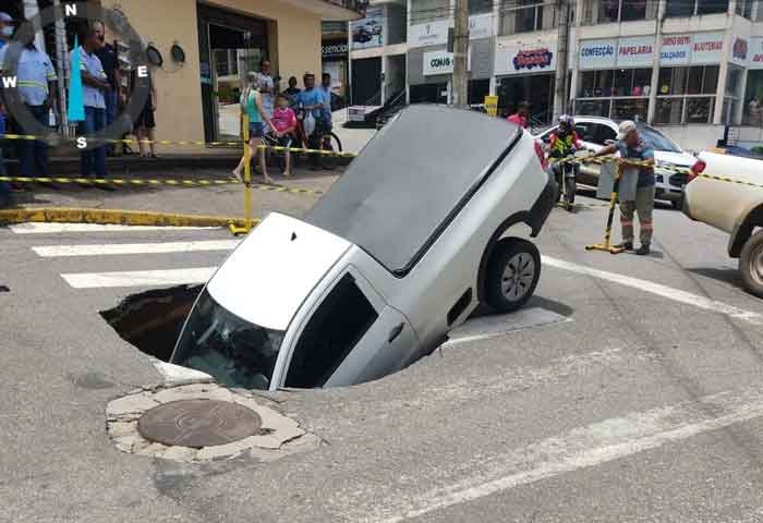 Uma caminhonete saveiro caiu em uma cratera no bairro Novo Horizonte em João Monlevade na tarde desta segunda-feira (09/01).