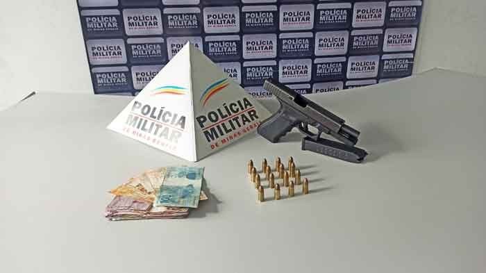 Em continuidade das buscas, foram encontrados e apreendidos 16 munições cal. 9mm, 01 carregador de pistola GLOCK, cal. 9mm, R$ 514,60 em dinheiro e 01 celular.
