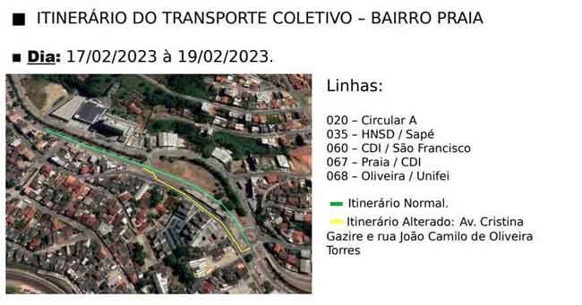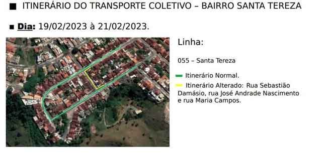 No bairro Santa Tereza, a partir do dia 19/02 às 20h, as ruas Sebastião Damásio e Maria Campos só será permitido o tráfego local. A mesma estratégia acontece na avenida Cristina Gazire no dia 17/02, às 20h.