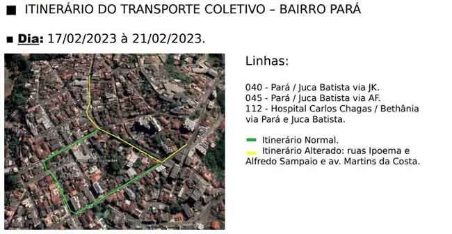 Na rua Desembargador Drumond, no Campestre, estará permitido apenas o trânsito local. O mesmo acontece nas ruas Cassimiro Andrade, Minervino Bethônico, Trajano Procópio, Mestre Emílio e Dr. Nelson Lima, no bairro Pará.