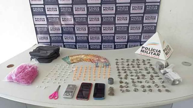 Depois de abordado e contido, foi localizado cerca de 03 barras de maconha (tamanho médio), 77 buchas de maconha, 01 porção de maconha, 42 pedras de crack, 45 pinos de cocaína, R$ 1.184,00 reais em dinheiro, 02 celulares, 01 balança de precisão, 01 dichavador, 01 tesoura, 01 bolsa e vários pinos vazios usados comumente para acondicionamento de cocaína