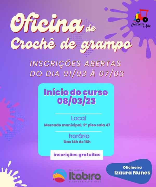 A primeira oficina do projeto Revigorar – Oficinas de trabalhos manuais, abre as inscrições a partir desta quarta-feira (1º de março), com 15 vagas para o curso de Crochê de Grampo. As inscrições podem ser feitas gratuitamente no Mercado Municipal, 2º piso, sala 47, no horário das 14h às 16h.
