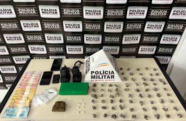 A Polícia Militar conseguir apreender 1 barra de maconha, 1 tablete de maconha, 69 buchas de maconha, 7 pedras de crack, 2 rádios HTs, 2 bases para carregar HT, 1 bateria de HT, 1 gilete, R$:310,00, 2 celulares e diversas embalagens para dolagem de drogas