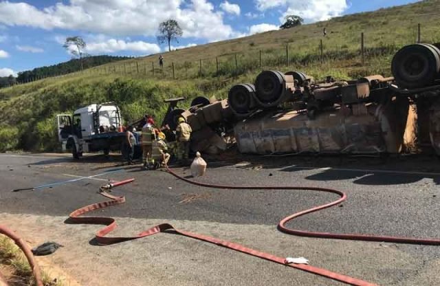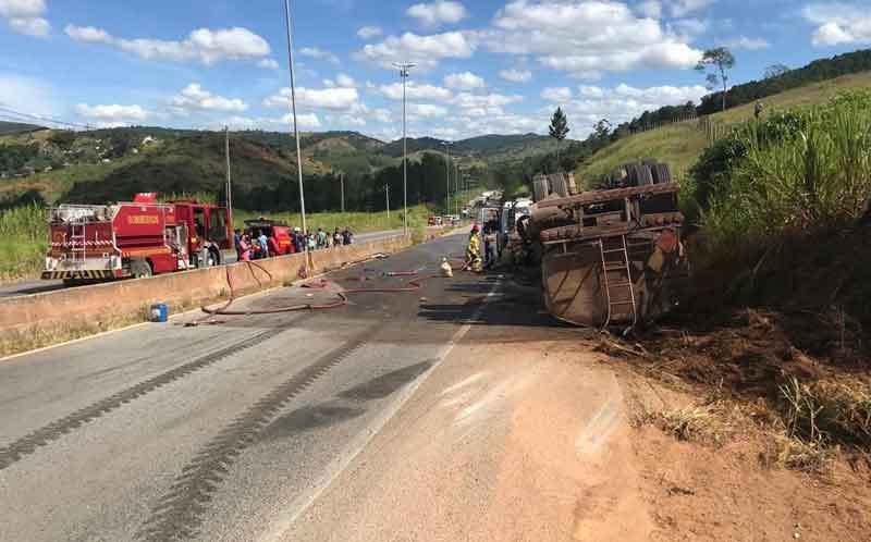 Nesta tarde de sábado (04/03), por volta das 13:30min, de acordo com informações do Corpo de Bombeiros, um caminhão bi-trem transportando aproximadamente 20.000 litros de óleo diesel tombou na via.