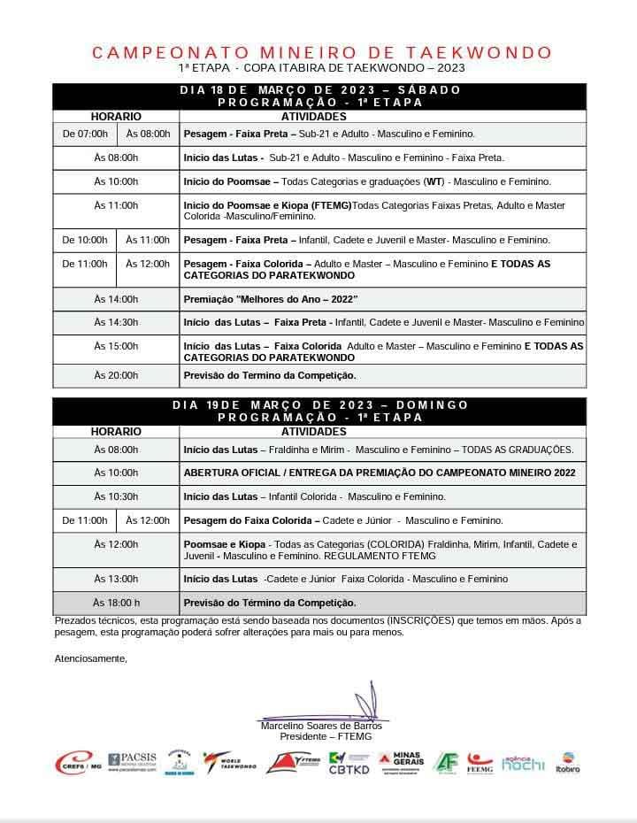 Durante o evento também será realizada a entrega da premiação Melhores do Ano e as equipes campeãs em 2022. As outras duas etapas do mineiro de Taekwondo acontecerão em Mariana e Igarapé. Confira a programação: