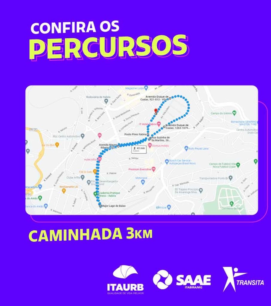 – Para a caminhada de 3 km, as participantes seguem pela avenida Duque de Caxias até a avenida Mauro Ribeiro e continuam por toda extensão dessa via, sentido bairro Amazonas. Elas fazem o retorno na rotatória próximo ao túnel e voltam pela Mauro Ribeiro; e seguem de volta pela avenida Duque de Caxias até o ponto da largada.
