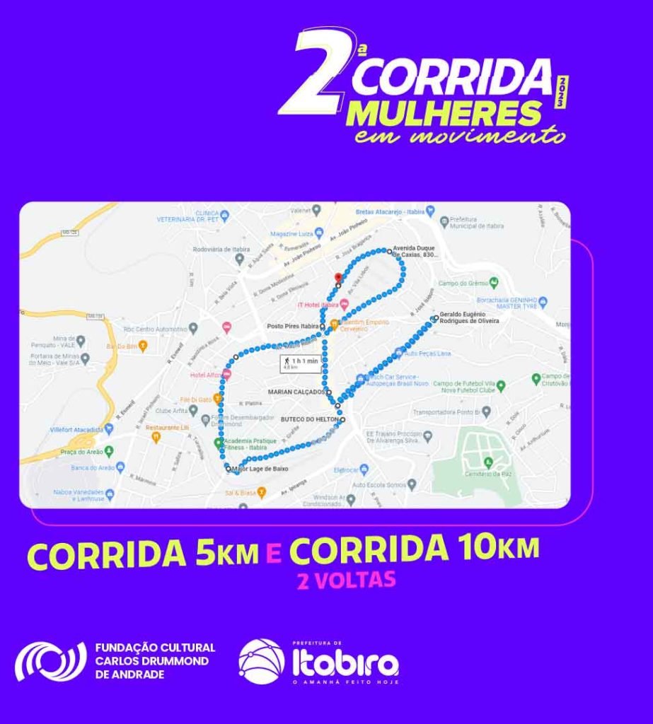 A 2ª Corrida Mulheres em Movimento é promovida pela Prefeitura de Itabira, com parceria da Itaurb, Serviço Autônomo de Água e Esgoto (Saae), Fundação Cultural Carlos Drummond de Andrade (FCCDA), Transita, GymPass, UniFuncesi, Centro de Valorização da Vida (CVV), Polo Econômico da Mulher (PEM), Farmácia Indiana.