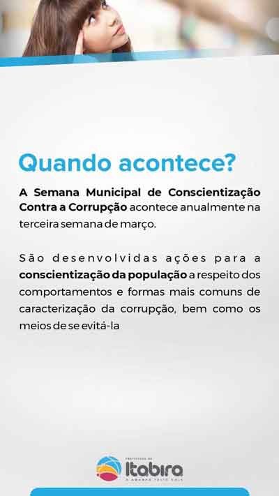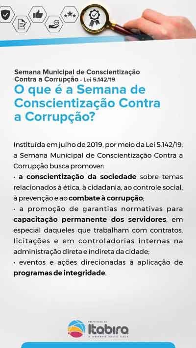 A Secretaria Municipal de Auditoria Interna e Controladoria (SMAIC), responsável pela Semana de Conscientização Contra a Corrupção, desenvolve atividades sobre ética, cidadania, controle social, prevenção e combate à corrupção; promoção das garantias normativas para capacitação permanente dos servidores; além de ações direcionadas à discussão e à aplicação de programas de integridade.