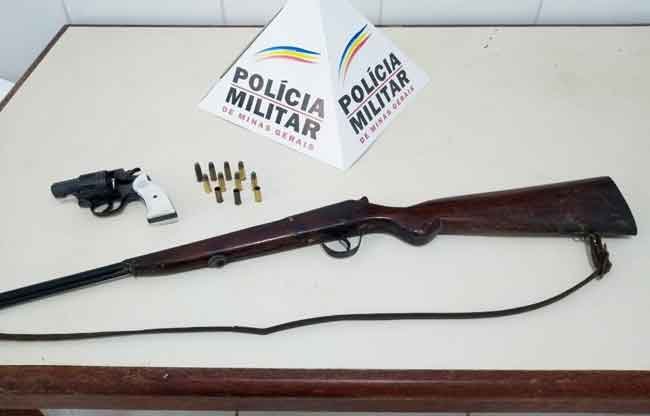 No local foi feito contato com o morador e durante as buscas foram encontradas duas armas de fogo, sendo 01 revólver calibre 32 e 01 espingarda polveira, além de 11 munições calibre 32.