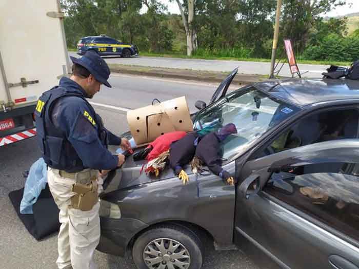 Por volta do meio-dia desta terça-feira (11/04), a Polícia Rodoviária Federal (PRF) resgatou 15 aves (galos de briga), apreendeu uma arma de fogo e prendeu dois homens, na altura do km 609 da BR-381, município de Oliveira (MG).