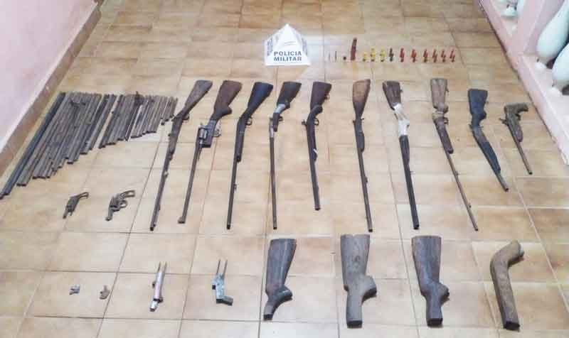Durante a ação, os militares encontraram o suspeito e, após buscas na casa, foram apreendidas 10 espingardas de diversos calibres, 2 revólveres, 1 garruchão de fabricação artesanal, 4 coronhas, 2 mecanismos de arma de fogo, 2 cãos de arma de fogo, 34 canos de arma de fogo, 19 munições de espingarda de calibres diversos, sendo algumas picotadas, 3 recipientes contendo pólvora, 6 cartuchos de calibre .22, sendo três picotados, e 5 espoletas.