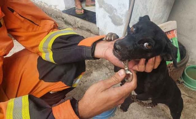 Com muito cuidado, os bombeiros tentaram tranquilizar o cão e passar segurança antes de realizar a manobra para retirar o objeto. Depois de um tempo de contato com o animal, os militares conseguiram retirar o gancho de forma segura e deixar o cão em boas condições.