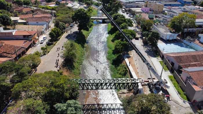 A obra de construção da passarela de pedestres que interligará os bairros Poção e Conselho ao Centro, em Santa Maria de Itabira, recebeu a estrutura metálica nesta segunda-feira, 12 de junho. A passarela tem 29 metros de comprimento por 2,4 metros de largura. Pesando cerca de 20 toneladas, foi necessária uma grande mobilização, com a utilização de um guindaste com capacidade para até 80 toneladas e três carretas com contrapesos, para garantir a segurança da instalação.