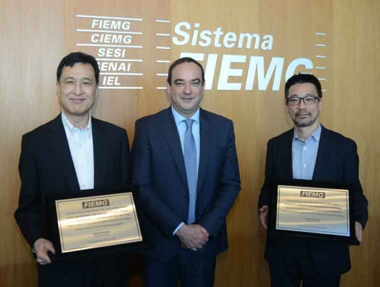 Nessa terça-feira (4/7), o CEO do Grupo Oji e Presidente da Oji Holdings, Hiroyuki Isono, e o Diretor-Presidente Executivo da CENIBRA, Takashi Nakajima, estiveram na sede da FIEMG e receberam das mãos do Presidente da federação, Flávio Roscoe, uma placa de homenagem pelo aniversário das empresas. Neste ano, a Oji Holding completa 150 anos e a CENIBRA 50. A honraria se deu pela atuação e efetiva contribuição das empresas para o desenvolvimento econômico e social de Minas Gerais e do Brasil.