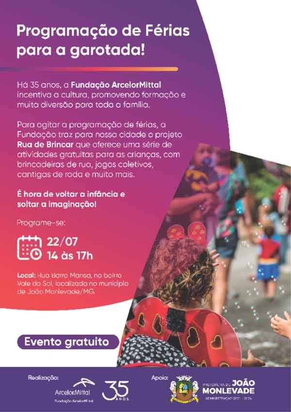 A Prefeitura de João Monlevade, por meio da Secretaria Municipal de Esporte e Lazer, apoia mais um evento voltado para o lazer da criançada nas férias de julho: O Rua de Brincar, realizado pela Fundação ArcelorMittal. A rua de lazer acontece no próximo sábado (22), das 14h às 17h na rua Barra Mansa, no bairro Vale do Sol.