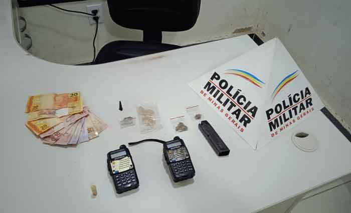 Após receberem denúncias sobre atividades de tráfico de drogas na quadra de esportes do bairro, as equipes da PMMG realizaram uma operação no local. Durante a ação, os policiais lograram êxito na prisão em flagrante de um traficante e dois usuários de drogas, além de apreenderem dois rádios comunicadores, buchas de maconha e um carregador de pistola calibre .380.