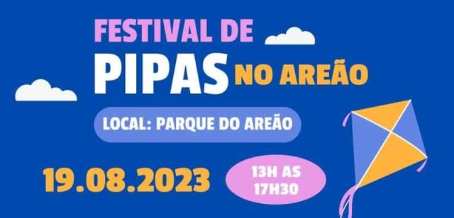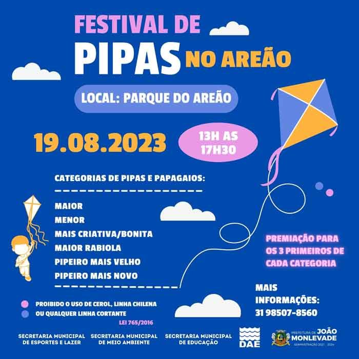 A Prefeitura de João Monlevade vai realizar no próximo dia 19 (sábado) o seu 1° Festival de Pipas. O evento será no Parque do Areão, das 13h às 17h30 e é organizado pelas secretarias municipais de Esporte e Lazer e de Meio Ambiente, com o apoio da Secretaria Municipal de Educação e do Departamento Municipal de Águas e Esgotos (DAE).