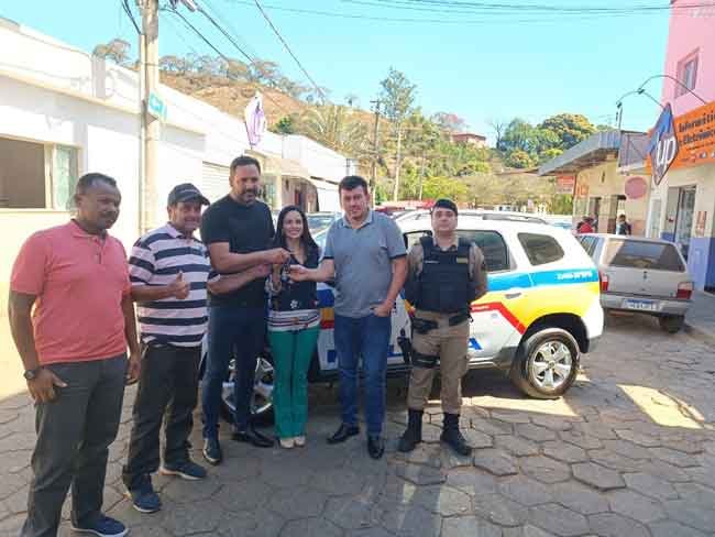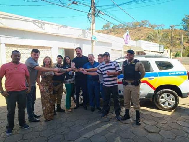 A entrega da chave da viatura foi feita pelo Deputado Diego Andrade, o Prefeito Reinaldo das Dores Santos e Vereadores dos municípios.