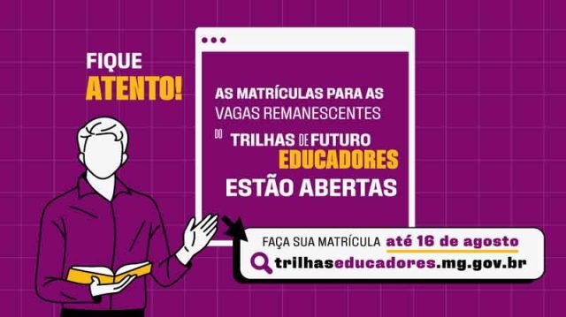 Servidores da SEE/MG que perderam o prazo de inscrição na primeira fase na 2ª edição do Trilhas de Futuro Educadores e têm interesse nas vagas dos cursos de aperfeiçoamento também terão uma nova oportunidade de preencher alguma vaga remanescente, no período de 17/8 a 21/8. A matrícula também deve ser efetivada até o dia 22/8.