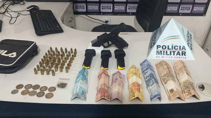 No momento da captura, o foragido estava portando uma Pistola 9mm, acompanhada de 03 carregadores. A arma, após consulta no sistema policial, foi identificada como produto de um crime de roubo anterior. Além disso, foram apreendidas 46 munições de calibre 9mm, um carregador de maconha e 606,75 reais em espécie.