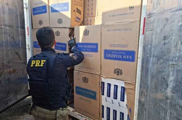 O homem foi preso pela PRF. Foram encontradas aproximadamente 300 caixas no baú do caminhão, contendo o equivalente a 150 mil maços de cigarros, da marca San Marino, de origem Paraguaia.