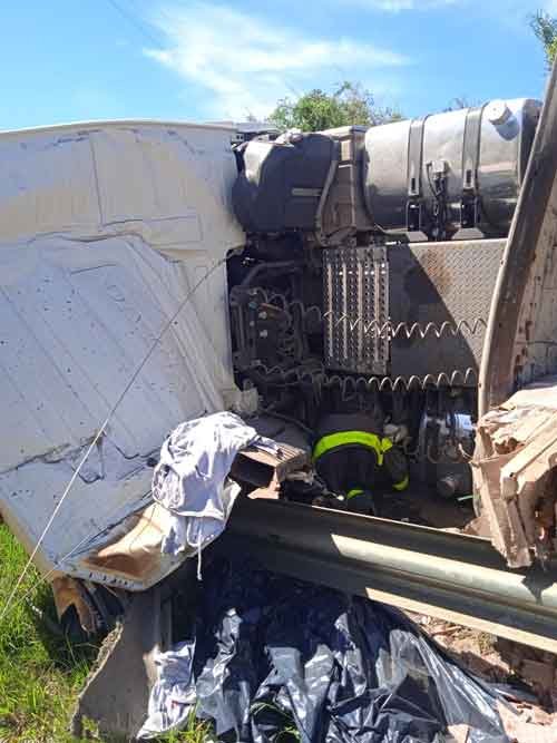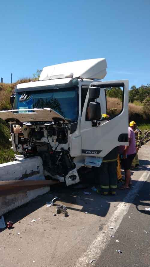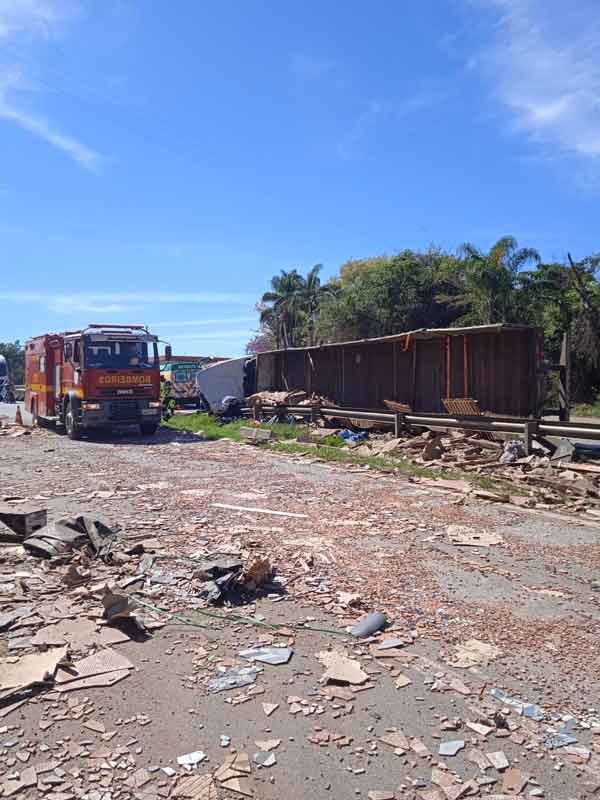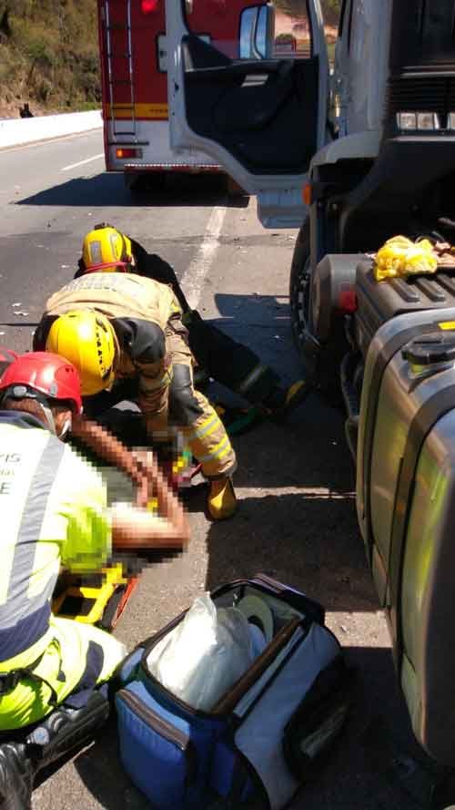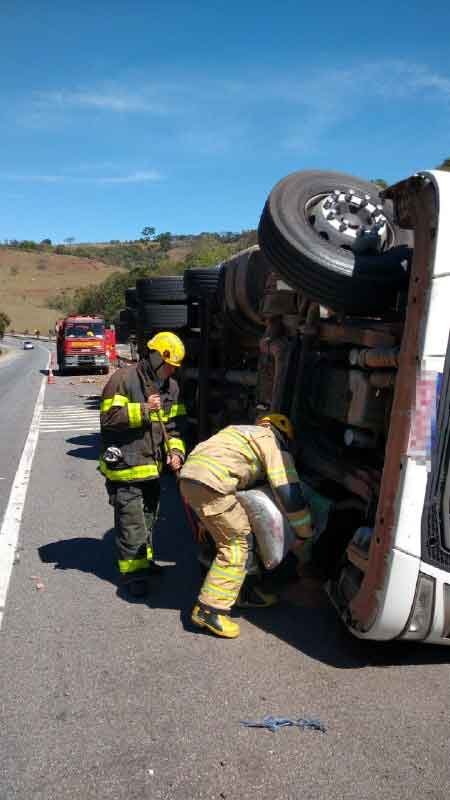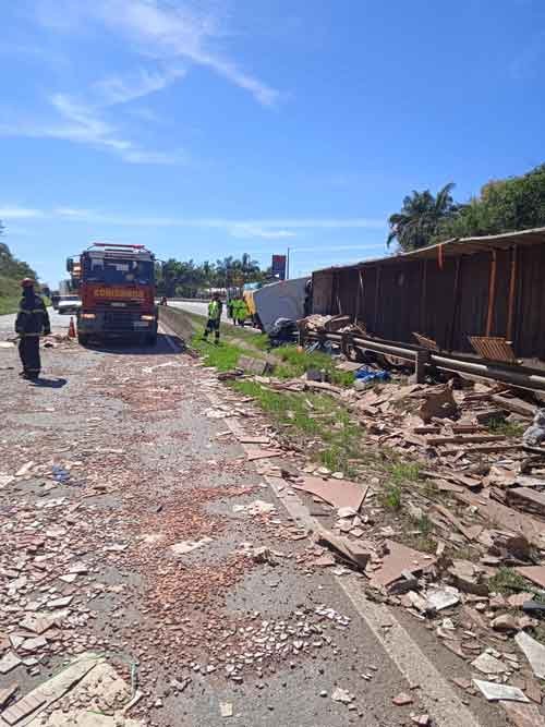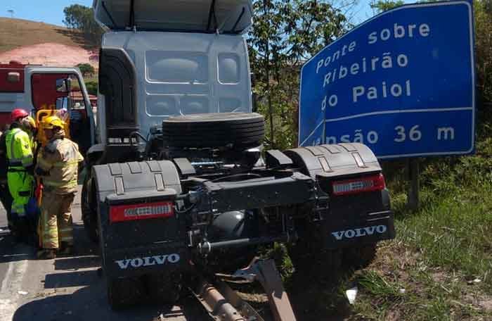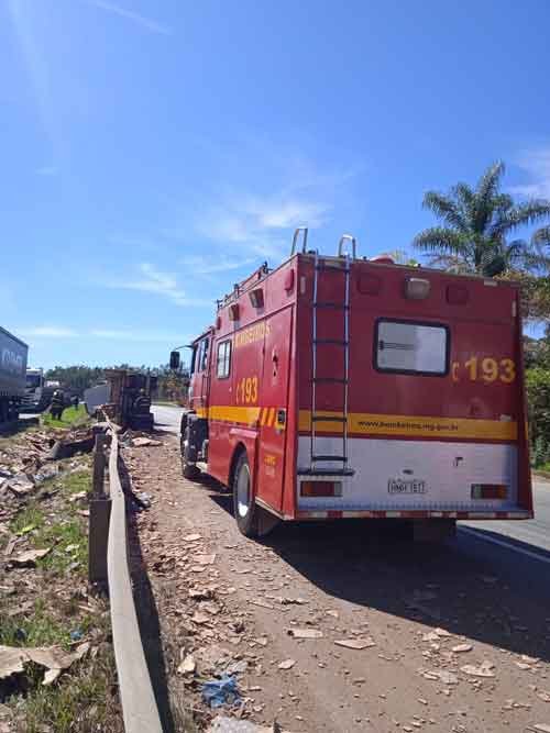 Após o atendimento nessa ocorrência, a equipe retornou a Oliveira, mas durante o trajeto, os bombeiros se depararam com um acidente envolvendo uma carreta que colidiu contra uma mureta na BR-381.