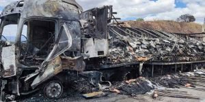 Vídeo; Caminhão com carga de salmão é consumido pelo fogo na BR-381 em Betim
