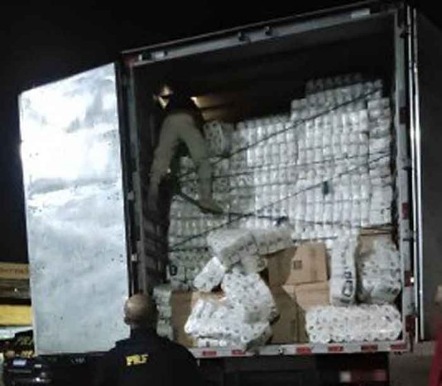 Durante a inspeção do compartimento de carga, verificou-se que a carga lícita, alegada pelo condutor, ocupava apenas as portas de acesso do baú, com o objetivo de ocultar o interior da carga, que continha 500 caixas de papelão, contendo 10 mil cigarros cada. A carga de origem paraguaia é avaliada em 875 mil reais.
