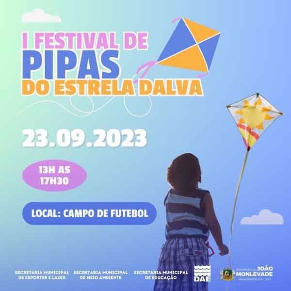 A Prefeitura de João Monlevade realizará no próximo dia 23 (sábado) o 1° Festival de Pipas do Estrela Dalva. O evento acontece no Campo de Futebol do bairro, das 13h às 17h30 e será organizado pelas secretarias municipais de Esportes e Lazer, Meio Ambiente, Educação e pelo Departamento Municipal de Águas e Esgotos (DAE).