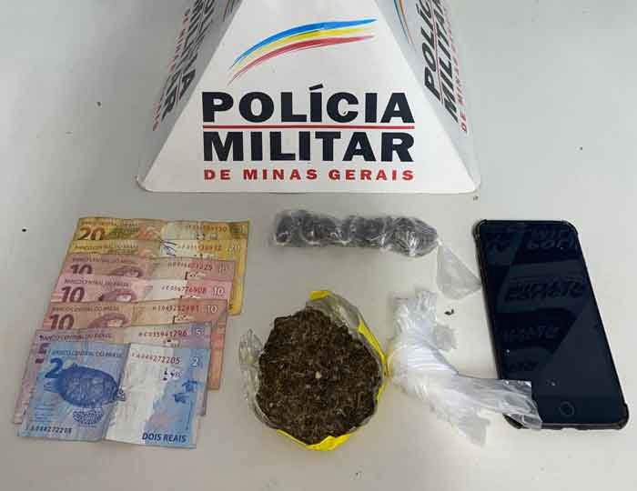 Apesar da conduta do suspeito, conseguiram os policiais abrir o portão e efetuar sua abordagem, ação que resultou da apreensão de uma pochete, 09 (nove) buchas de material de composição vegetal semelhante à maconha; 01 (um) tablete de material de composição vegetal semelhante à maconha; R$77,00 (setenta e sete) reais em moeda corrente; 01 (um) aparelho celular e material plástico geralmente utilizado na rolagem de entorpecentes.
