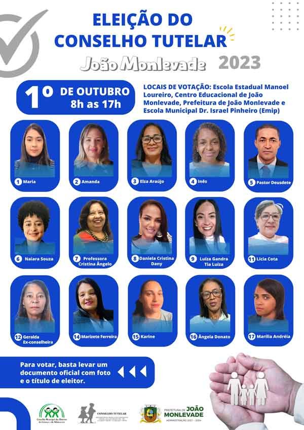 Este ano, quinze candidatos disputam vagas de conselheiro tutelar. São eles: Amanda Maria Borges de Oliveira, Ângela Maria Donato, Daniela Cristina Santos (Dany), Deusdete de Oliveira Belo (Pastor Deusdete), Elza Ferreira de Araújo, Geralda Magela Silva, Inês Terezinha Cândido, Karine Rebeca Ribeiro, Lícia Maria Cota, Luíza Cristina da Silva Gandra (Tia Luíza), Maria Cristina Ângelo Passos (Professora Cristina Ângelo), Maria José Rodrigues, Marília Andréia dos Santos, Marizete Ferreira e Naiara Souza Domingues.