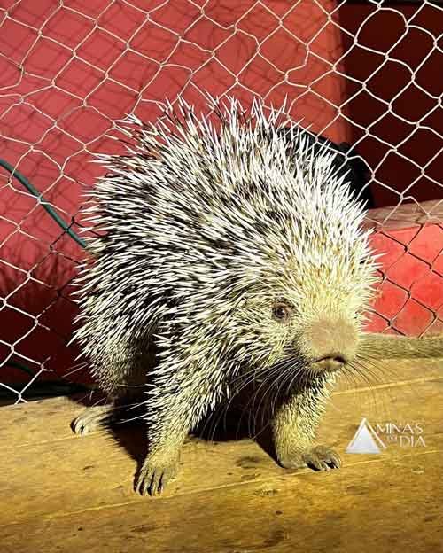 O Ouriço-cacheiro se faz presente nas copas das árvores do nosso Estado. Utiliza sua cauda preênsil para se locomover por entre os galhos. Sua pelagem, de dorso cinza amarelada e ventre variando de amarelo à marrom-acinzentado, possui pelos rígidos (espinhos) e pelos longos e finos, que podem esconder os espinhos.