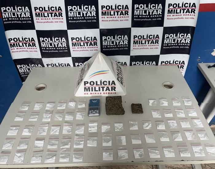 Em contato com o morador da residência onde os policiais observaram o adolescente guardando uma sacola branca, os militares tiveram a entrada franqueada ao quintal, local onde encontraram 64 papelotes de material esbranquiçado semelhante à cocaína e 01 tablete grande de material de origem vegetal semelhante à maconha.