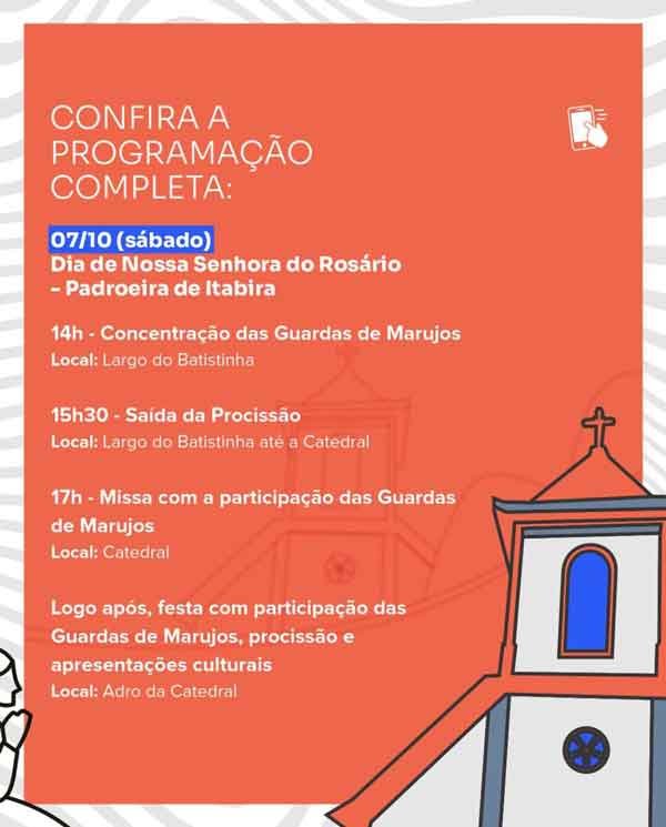 No sábado (7), os festejos ficam por conta da celebração à padroeira de Itabira, Nossa Senhora do Rosário. Haverá concentração das Guardas de Marujos, às 14h no Largo do Batistinha, procissão até a Catedral, missa, Guarda de Marujos. Logo após a missa das 17h acontecem apresentações culturais no adro da igreja.