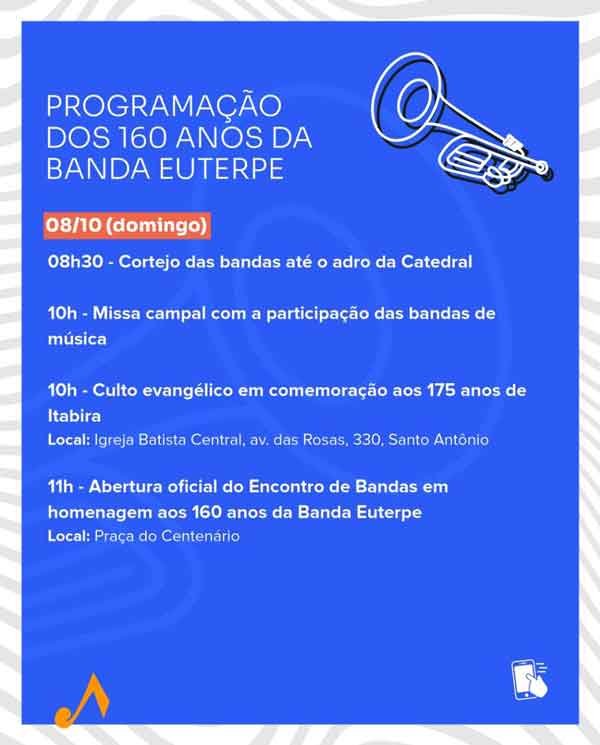 Em celebração aos 160 anos da Banda Euterpe, o domingo (8), contará com recepção de várias corporações musicais na Praça do Centenário, a partir das 8h30. Um cortejo de bandas segue para o adro da Catedral, onde acontece uma missa campal. A abertura oficial do Encontro de Bandas, em homenagem à Banda Euterpe será às 11h na Praça do Centenário. A Igreja Batista Central prepara um culto religioso em homenagem ao aniversário de Itabira. O culto será às 10h com uma programação especial.