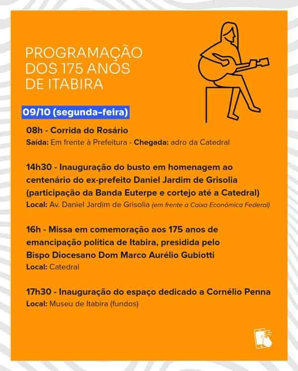 Já no dia do aniversário de Itabira, 9 de outubro, uma extensa programação vai marcar a data. Às 8h tem início as atividades com a corrida do Rosário. Uma homenagem ao ex-prefeito Daniel Jardim de Grisolia, com inauguração do busto e participação da Banda Euterpe, fará parte das celebrações.