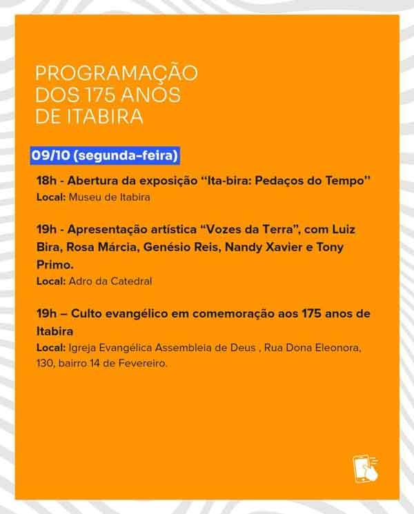 Ainda, neste dia, acontece a inauguração do espaço que homenageia Cornélio Pena; missa em comemoração aos 175 anos de Itabira; Culto religioso na Igreja Assembleia de Deus, abertura da exposição “Ita-bira: pedaços do tempo” e show com artistas itabiranos. Toda a programação é gratuita.