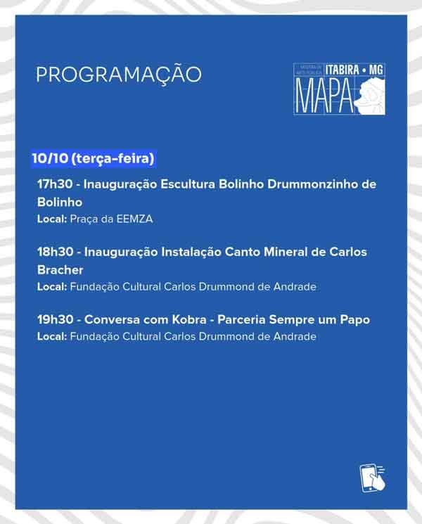 No dia 10, às 17h30 está programada a inauguração de uma escultura inédita, de 3,5 metros de altura com Raquel Bolinho, na Praça da EEMZA e às 18h30, instalação Canto Mineral de Carlos Bracher na Fundação Cultural Carlos Drummond de Andrade.