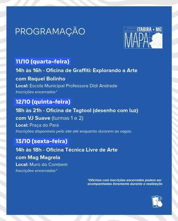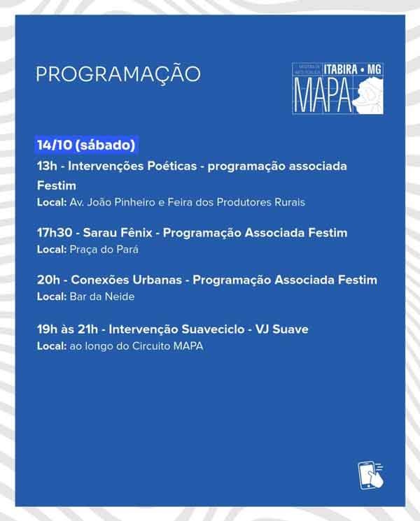 As ações do Mapa são gratuitas e seguem até o dia 15 de outubro. Confira toda a programação abaixo e também nas redes oficiais da Prefeitura de Itabira.